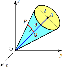 問題 Cを底面が半径2の円で高さが6の直円錐とし、これをxyz空間に頂点が原点Oで底