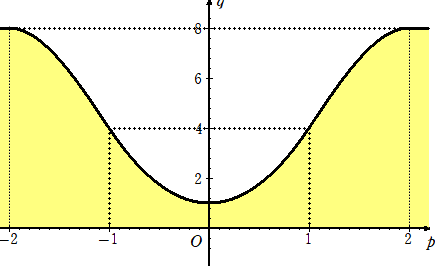 1≦p≦2 のとき、 F(p)=p3−3p2(p−2)−q=−2p3+6p2−q≧0